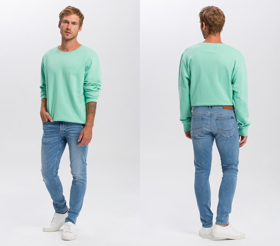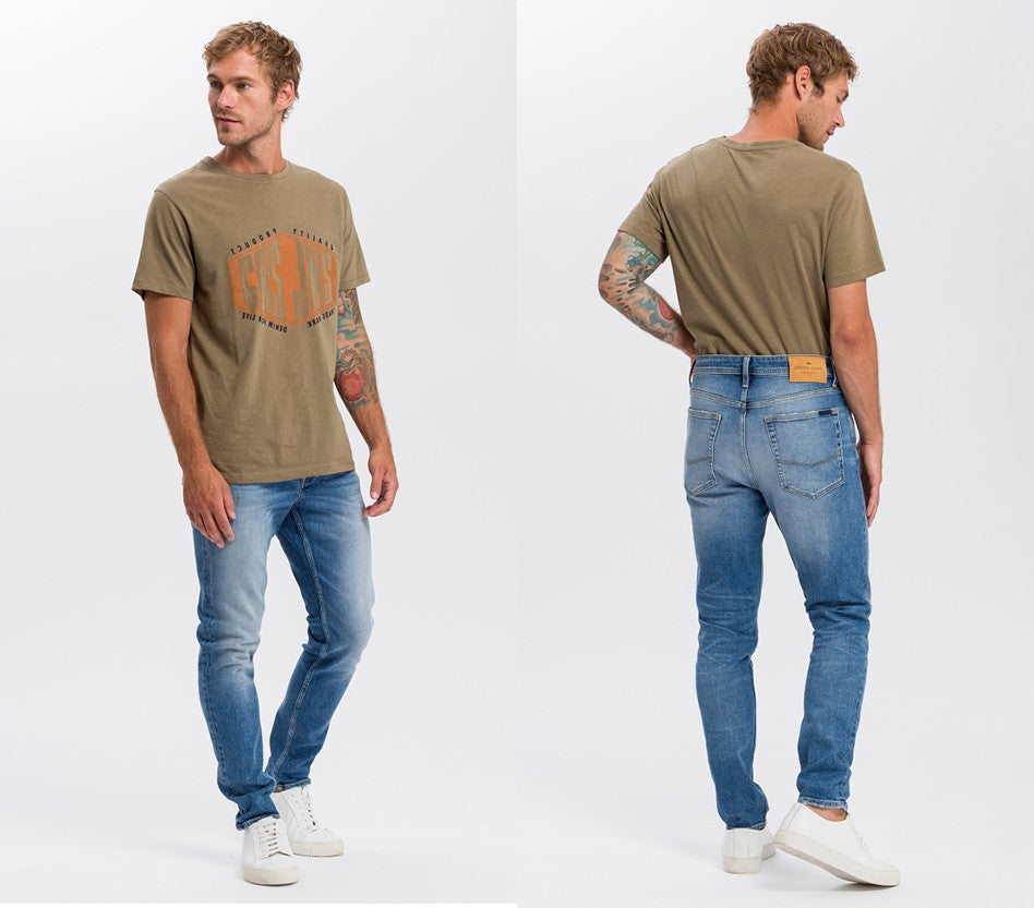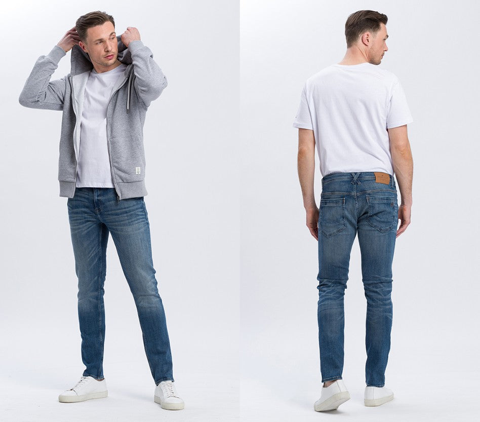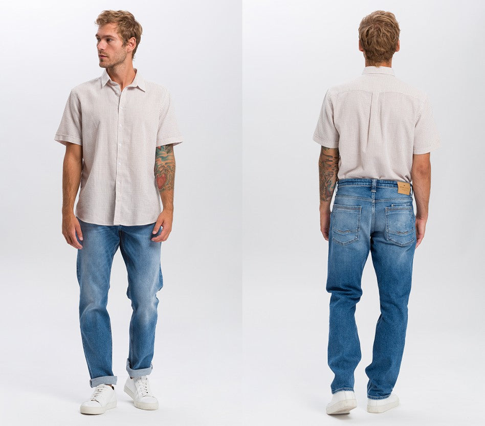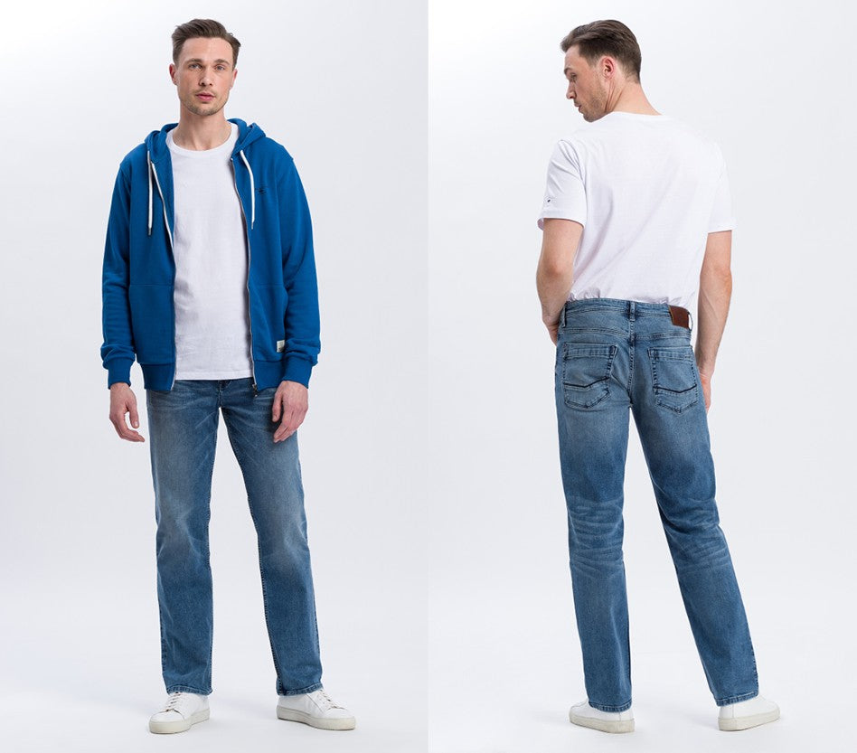 Straight Leg: The men's jeans are loosely cut and fall straight down the legs.